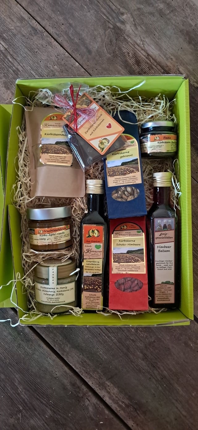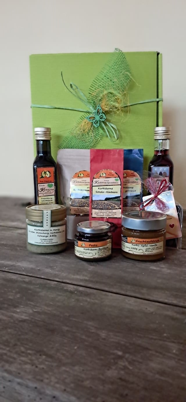 Alle Kürbiskernprodukte in dieser Geschenkbox stammen aus eigenem regionalen Anbau und werden in unserer kleinen Manufaktur mit viel Liebe und Sorgfalt weiterverarbeitet – ohne Zusatzstoffe, Konservierungsmittel oder künstliche Aromen.