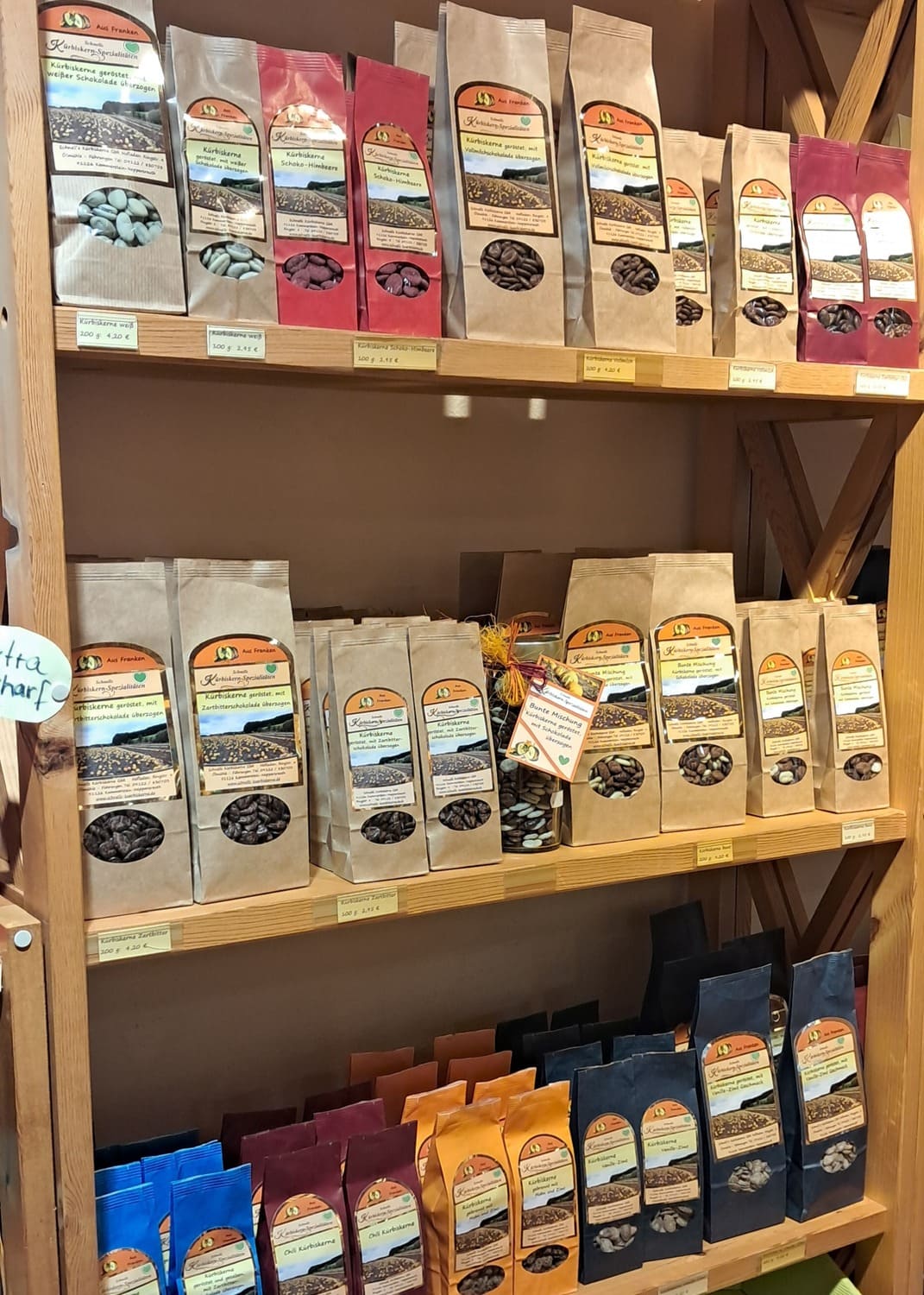Außerdem führen wir verschiedene Kürbiskernsorten, gerne auch zum Probieren: